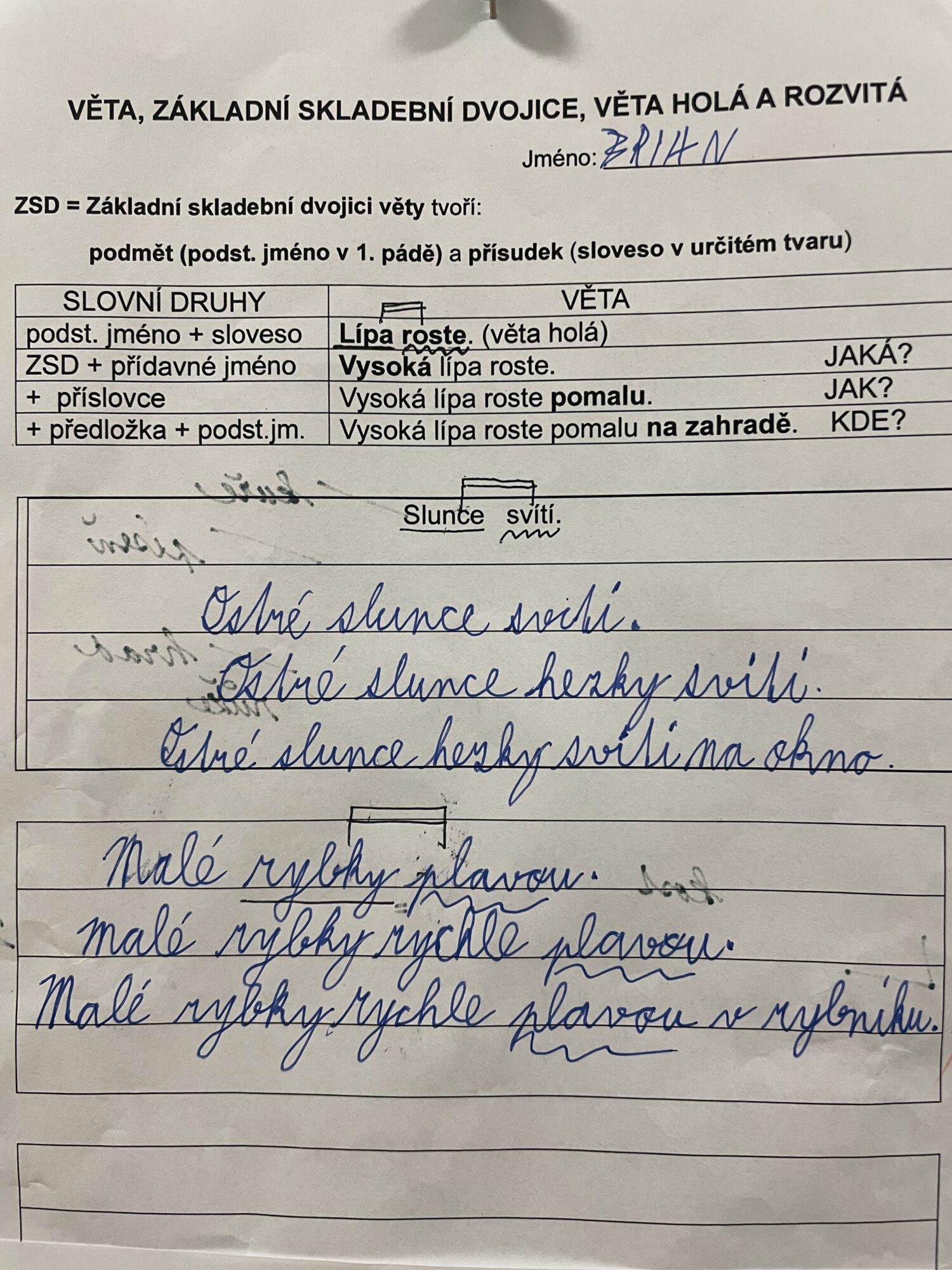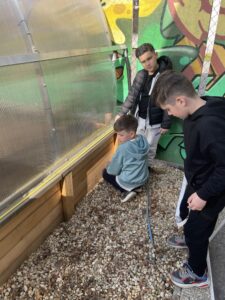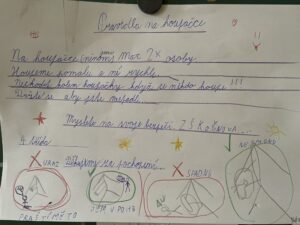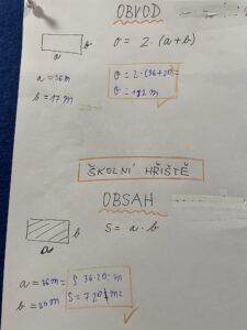Po skupinách jsme změřili a vypočítali obvod a obsah půdorysu skleníku, kurníku, hřiště a vyvýšeného záhonu. 🧮 Pozorovali jsme, co se děje na školním pozemku a zapisovali to ve větách holých s podmětem a přísudkem a ve větách rozvitých s dalšími slovními druhy. (Ryby plavou. Červené ryby plavou pomalu v jezírku.) Jedna žákyně sepsala i pravidla používání houpačky na hřišti, aby nedocházelo k úrazům. 🚑