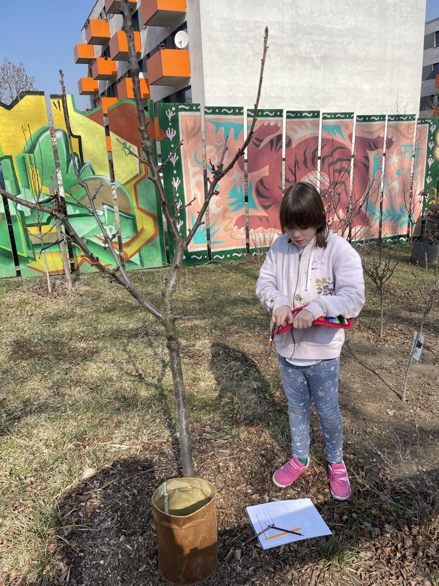 Dále jsme si začali vyplňovat tabulku s pozorováním růstu a vývoje pupenů větví ovocných stromů a keřů na školní zahradě. 🍎🍒 Povedeme si záznam další dva měsíce až začnou kvést. Pomocí aplikace Plantnet pojmenujeme jednotlivé stromy. 🌳