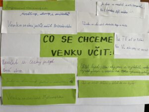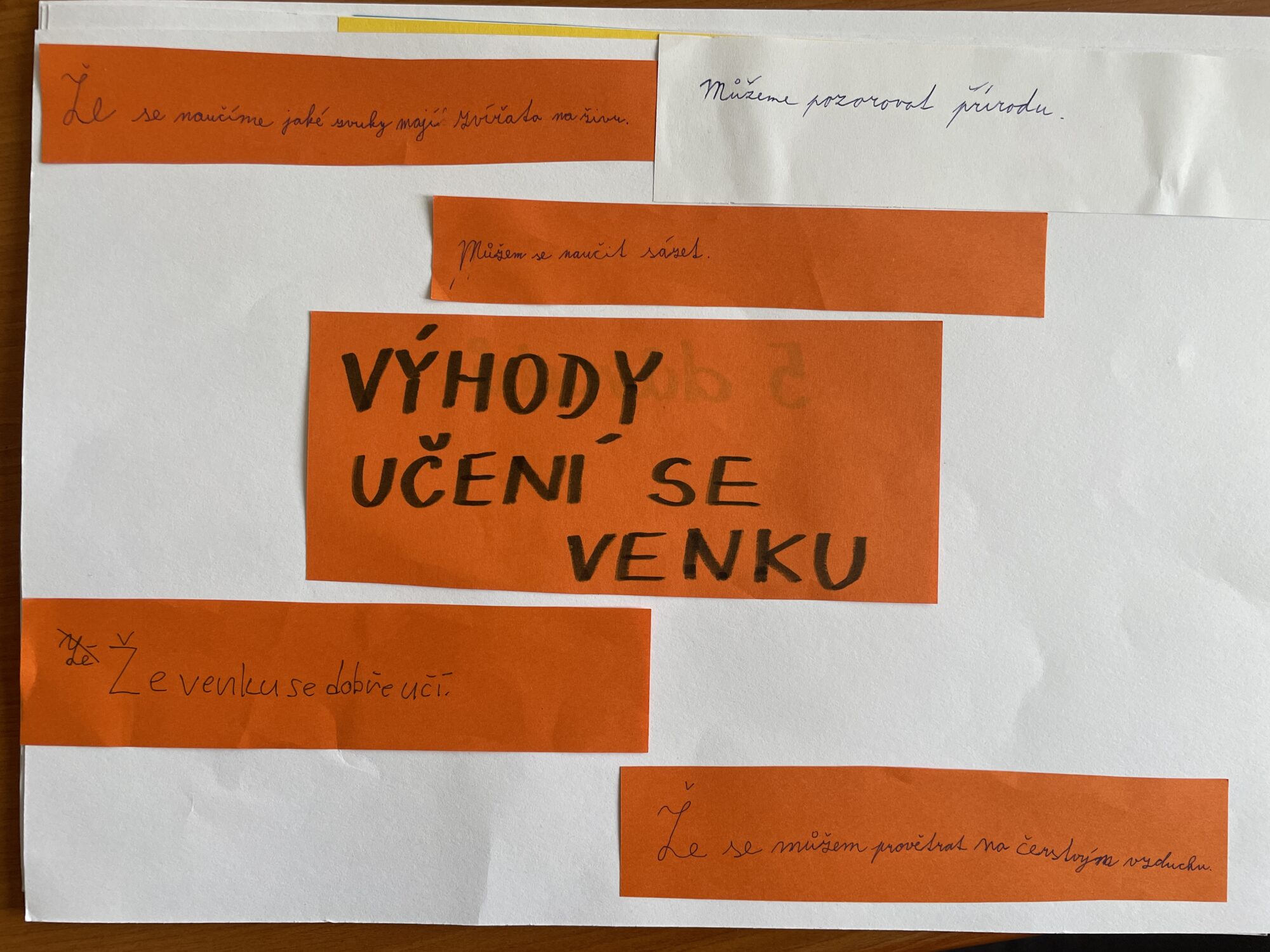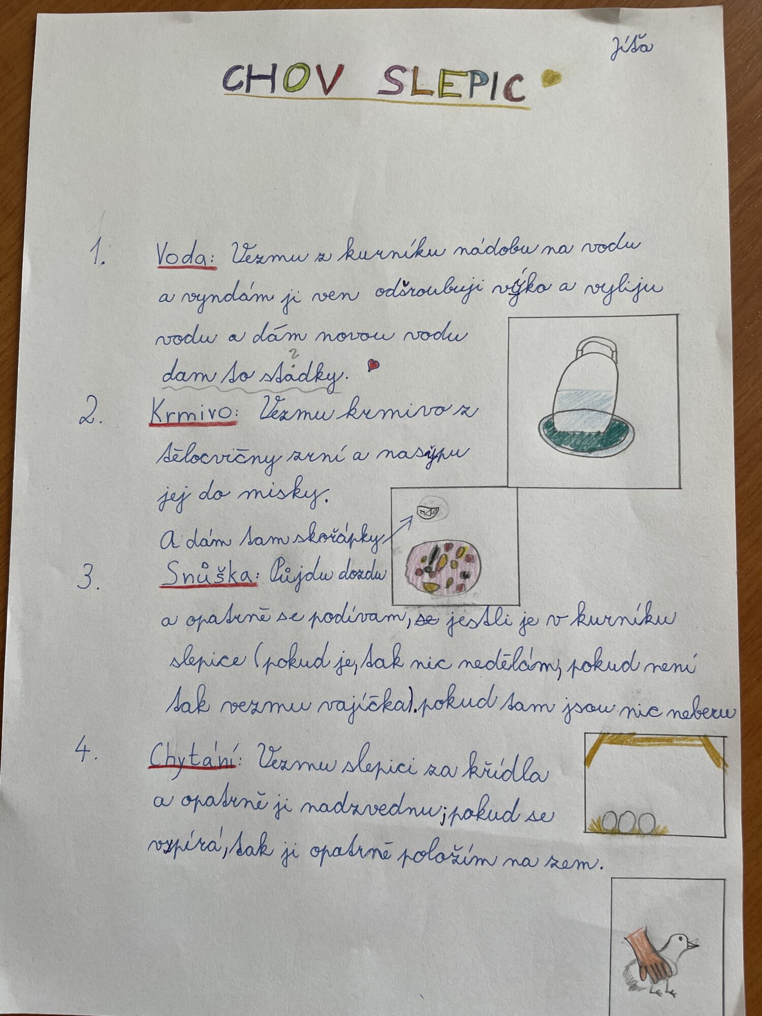 Na závěr vyučování jsme udělali reflexi učení venku, zvládli jsme toho hodně, navzájem jsme se učili a pomáhali si. Formou tří moudrých rad Děda Vševěda jsme si připomněli ty nejdůležitější pokyny pro péči o slepice. Zkrátka a jednoduše: spokojený den ve škole. 😎