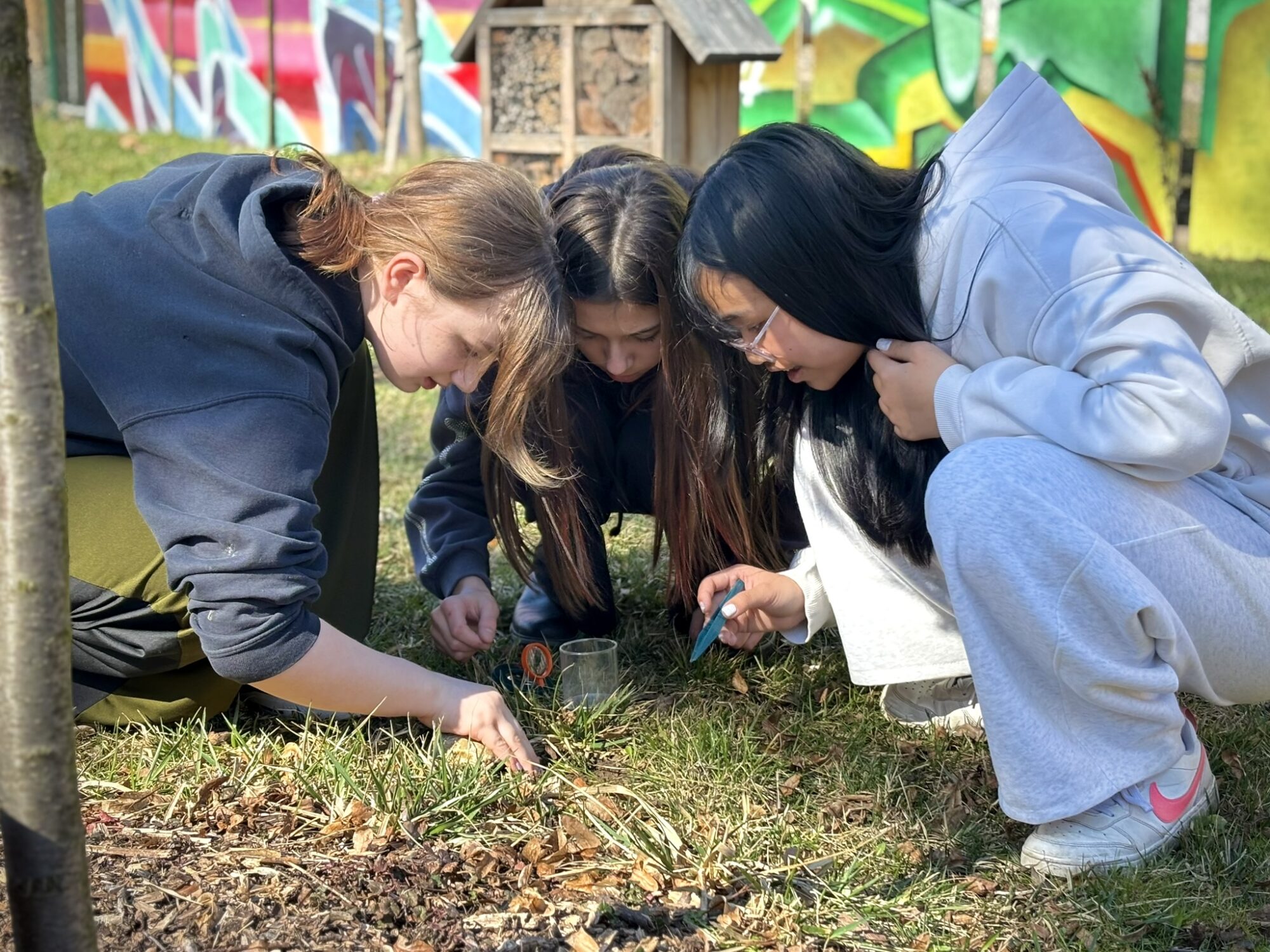 Vybaveni lupami a kapesními mikroskopy se žáci pustili do pečlivého průzkumu různých zákoutí zahrady – pod kameny, v trávě, v opadu listí i u stromů. Právě tato místa se ukázala jako nejbohatší na život. 🤓