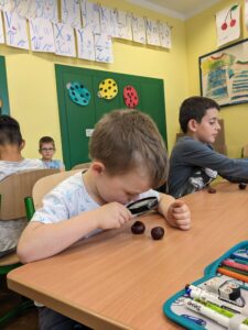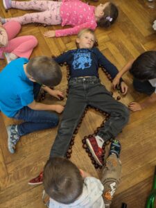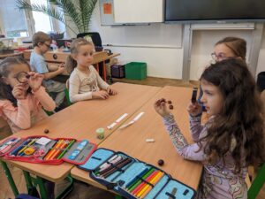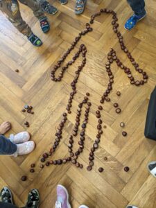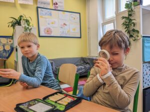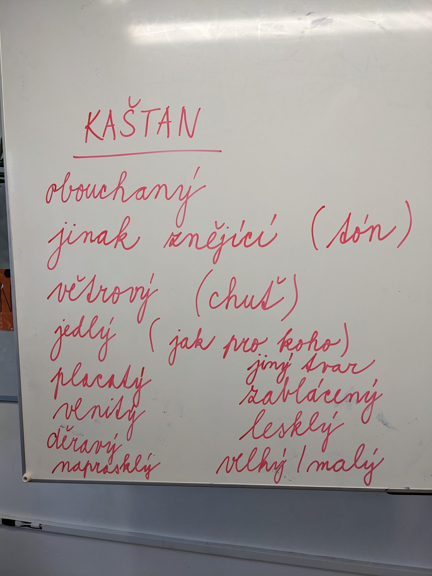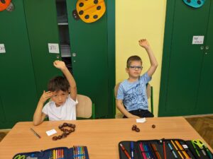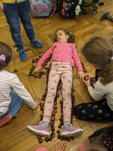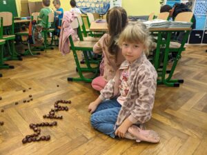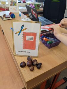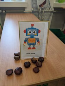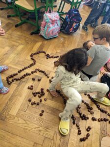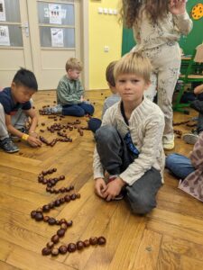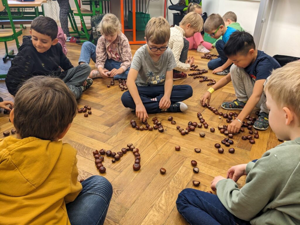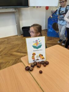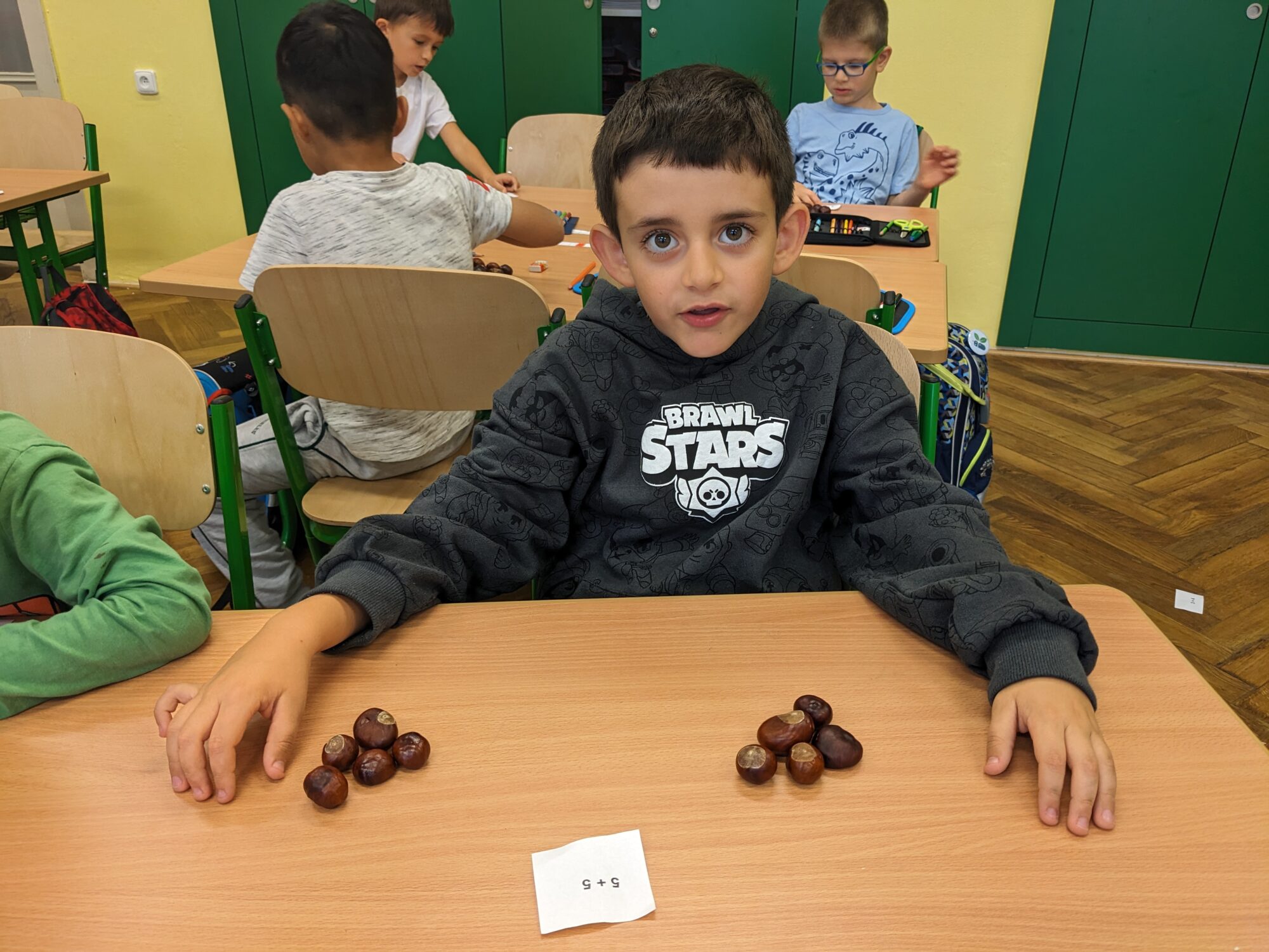 Prvňáčci skládali z kaštanů písmena a číslice a také si vyzkoušeli hru důvěry, při níž některé spolužáky obložili kaštany a vytvořili tak jejich siluety. 👤 V badatelském centru jsme s lupou zjišťovali, jaké kaštany jsou. 🧐 Děti měly odpovídat jedním slovem a učily se vytvářet někdy i úplně nová přídavná jména. 😎
