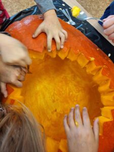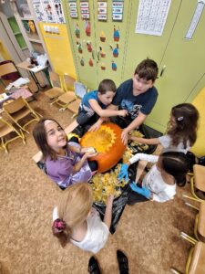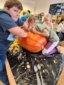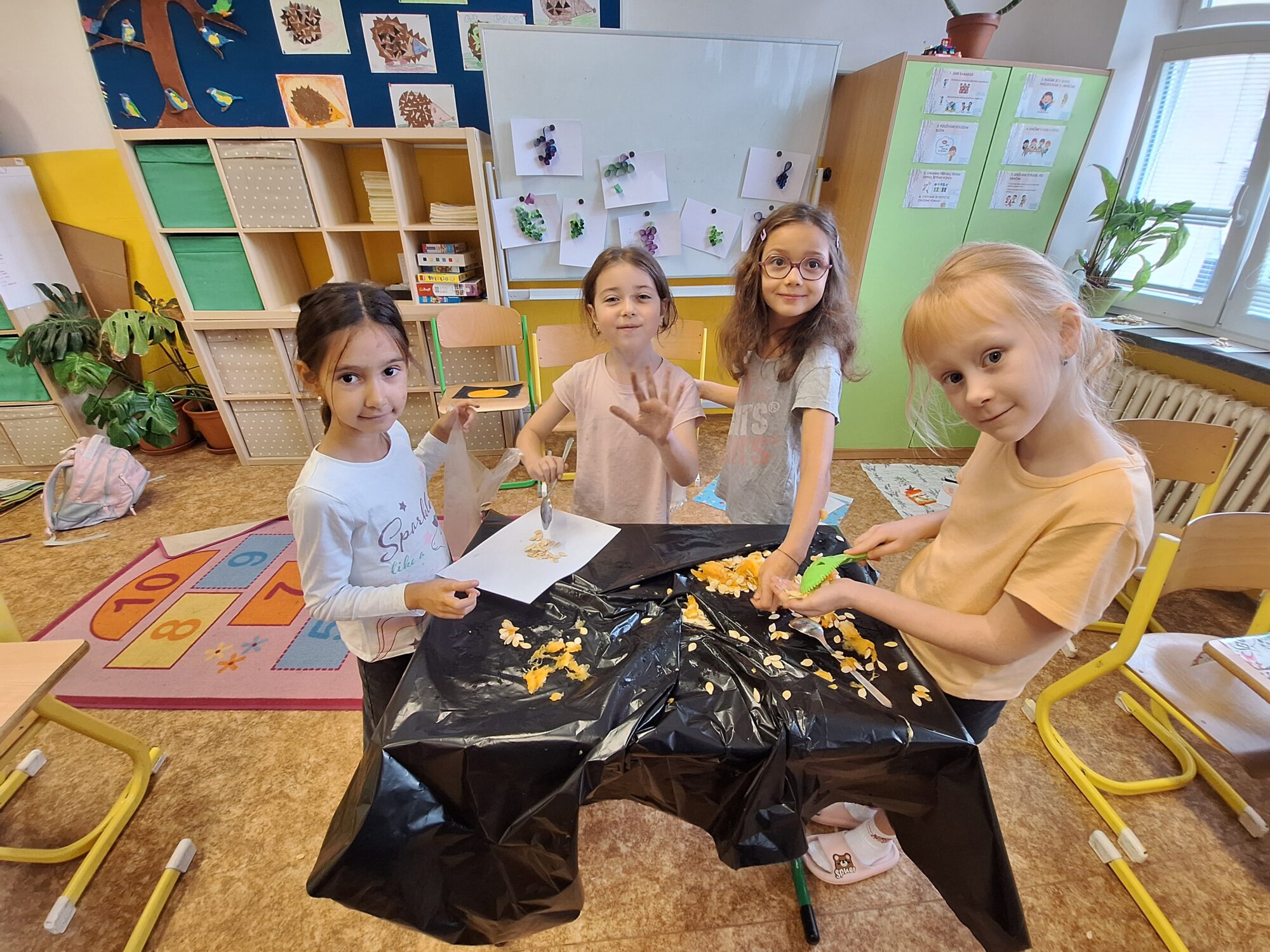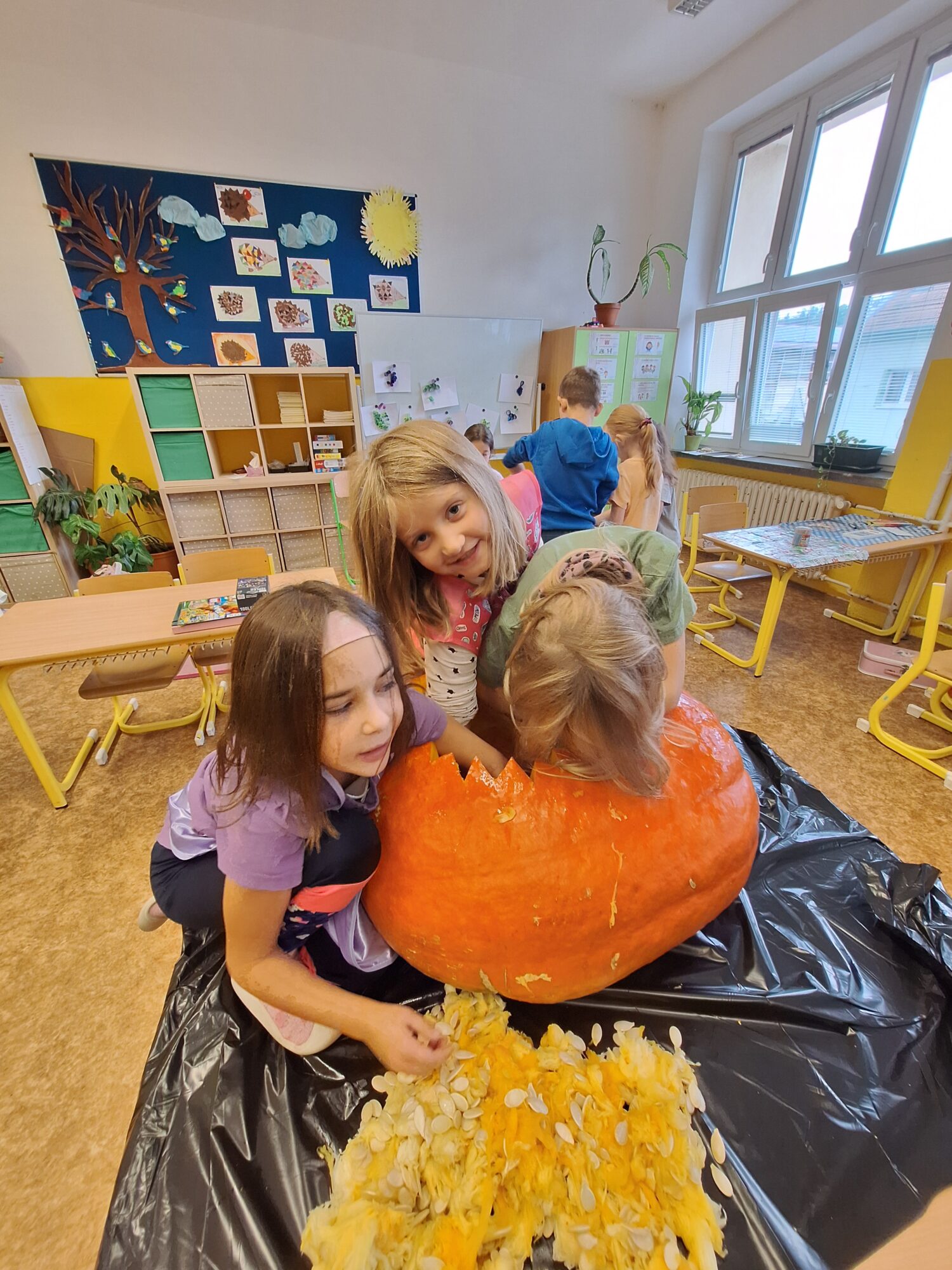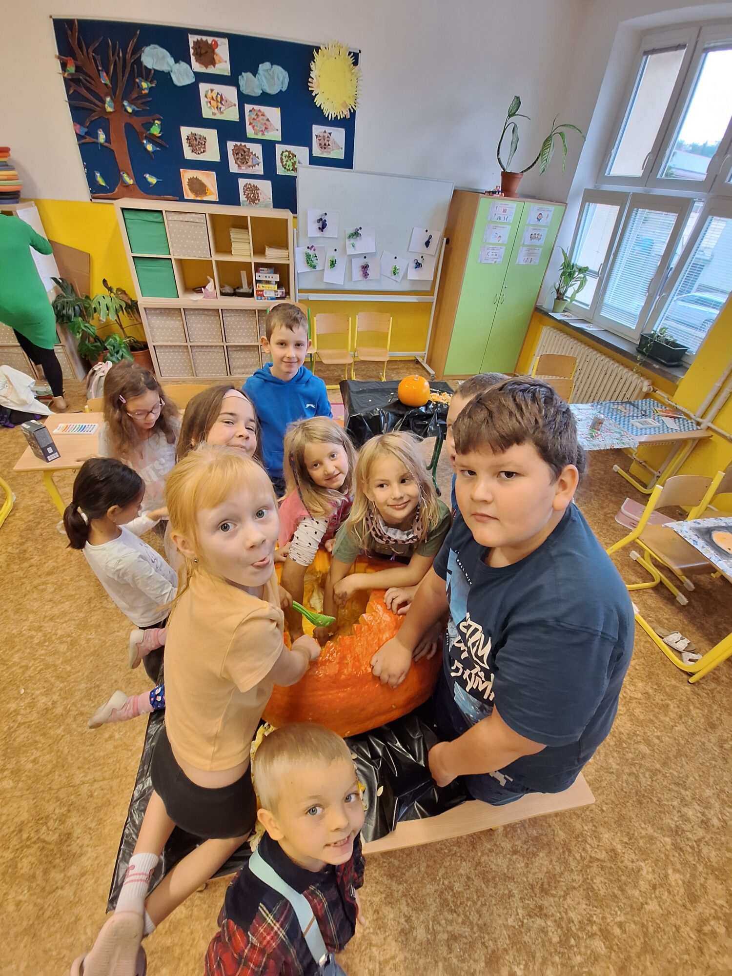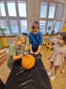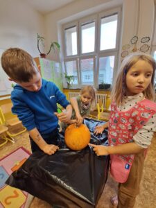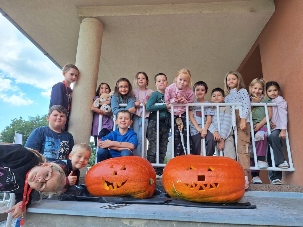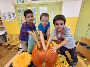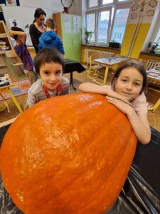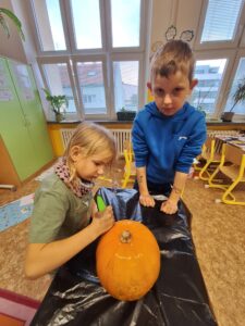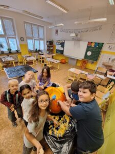 Ve 2. A se už chystáme na Halloween a Dušičky. 👻 Matěj před létem zadal jasný úkol: „Paní učitelko, tady máte rostlinku, vypěstujte nám dýni na vyřezání.“, který byl úspěšně splněn. S nadšením se děti dýní ujaly a vznikl krásný výtvor, který nám teď zdobí příchod do školy. 🎃 Sami můžete výsledek posoudit. 🧐