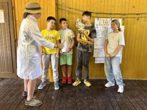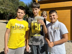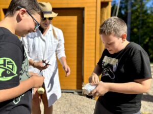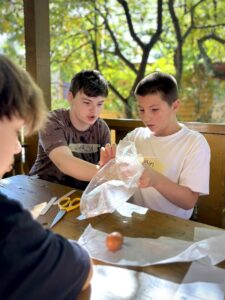 V další aktivitě jsme se proměnili na kosmické inženýry s důležitým úkolem. 🚀 Postavit ve skupinách odolnou vesmírnou loď pro kosmonauta, která ho při přistání na Zemi zvládne ochránit natolik, aby přežil. 👩🚀🧐 Ale nebylo to tak jednoduché. Stavbu bylo potřeba pořádně promyslet, protože jsme mohli používat jen materiál nakoupený z našeho omezeného rozpočtu. 💰 Po sestavení kosmických lodí jsme uspořádali tiskovou konferenci, při níž jsme zodpovídali zvídavé otázky novinářů. 🎤 Pak následoval přesun k testovací věži, kde kosmonauty a jejich lodě čekal volný pád z 12 metrů. 😱 Někteří kosmonauti přežili a jejich týmy zaslouženě slavily. 🥳