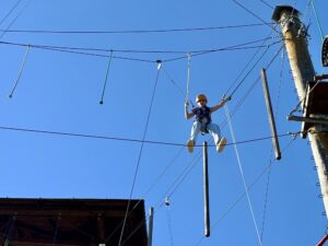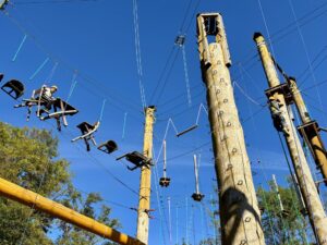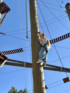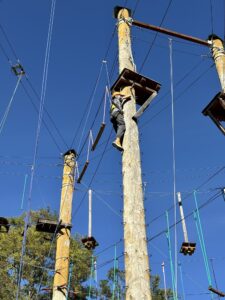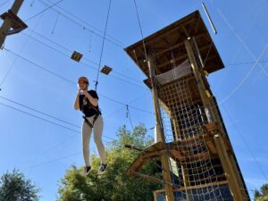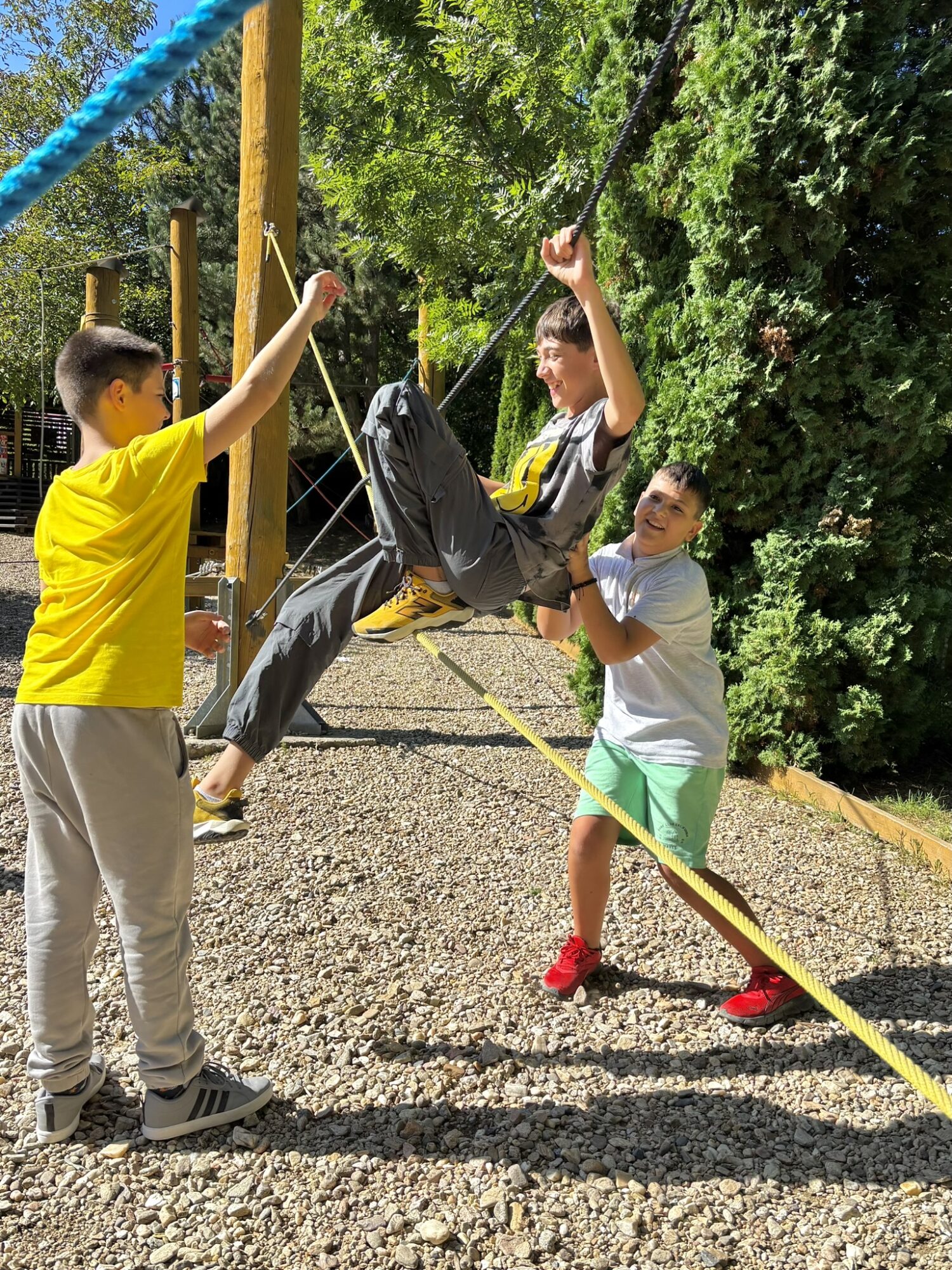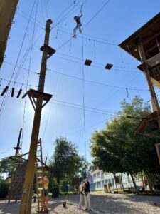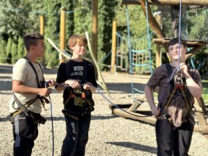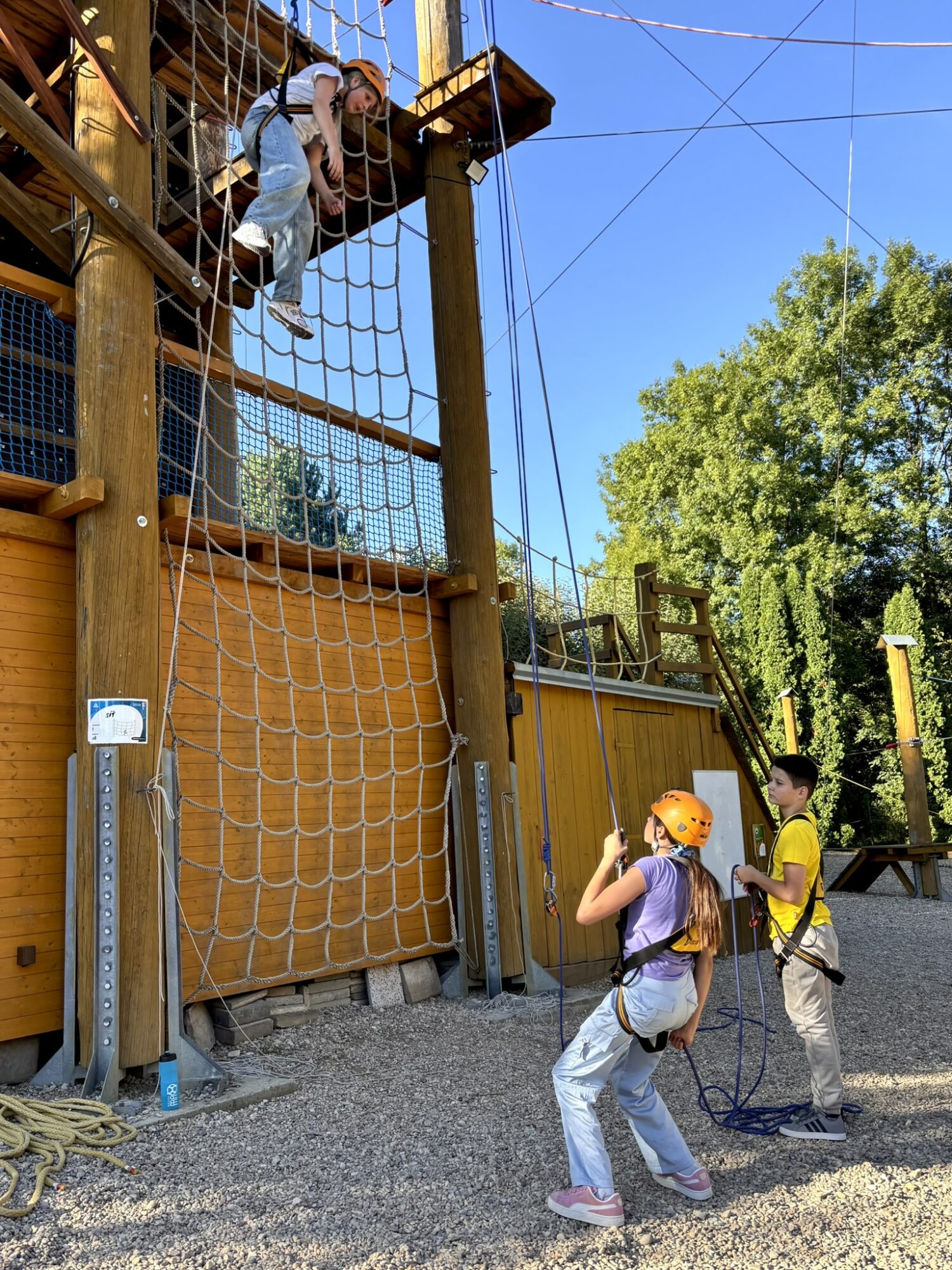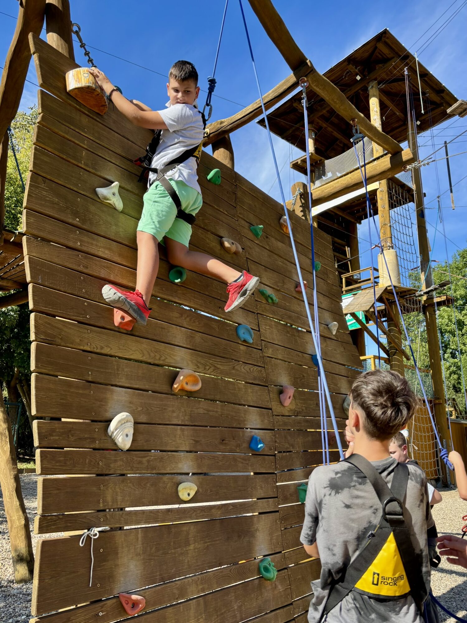 Po obědě již přišla řada na dlouho očekávanou část dne – lezení do výšek. 🙌 ☁Nejprve jsme si vše vyzkoušeli na nižších překážkách, kde jsme se učili spoléhat na kamarády, kteří nás jistili. A pak už šlo do tuhého! Po důkladném zaškolení jsme se vydali na vysoké překážky, kde jsme svoji bezpečnost doslova odevzdali do rukou kamarádům. 👐 I tady jsme se totiž jistili navzájem. Překážky nad námi zpočátku vyhrávaly. 😥 Ze země se nám všechny zdály jednoduché, ale při jejich zdolávání jsme brzy naráželi na své limity. 😬