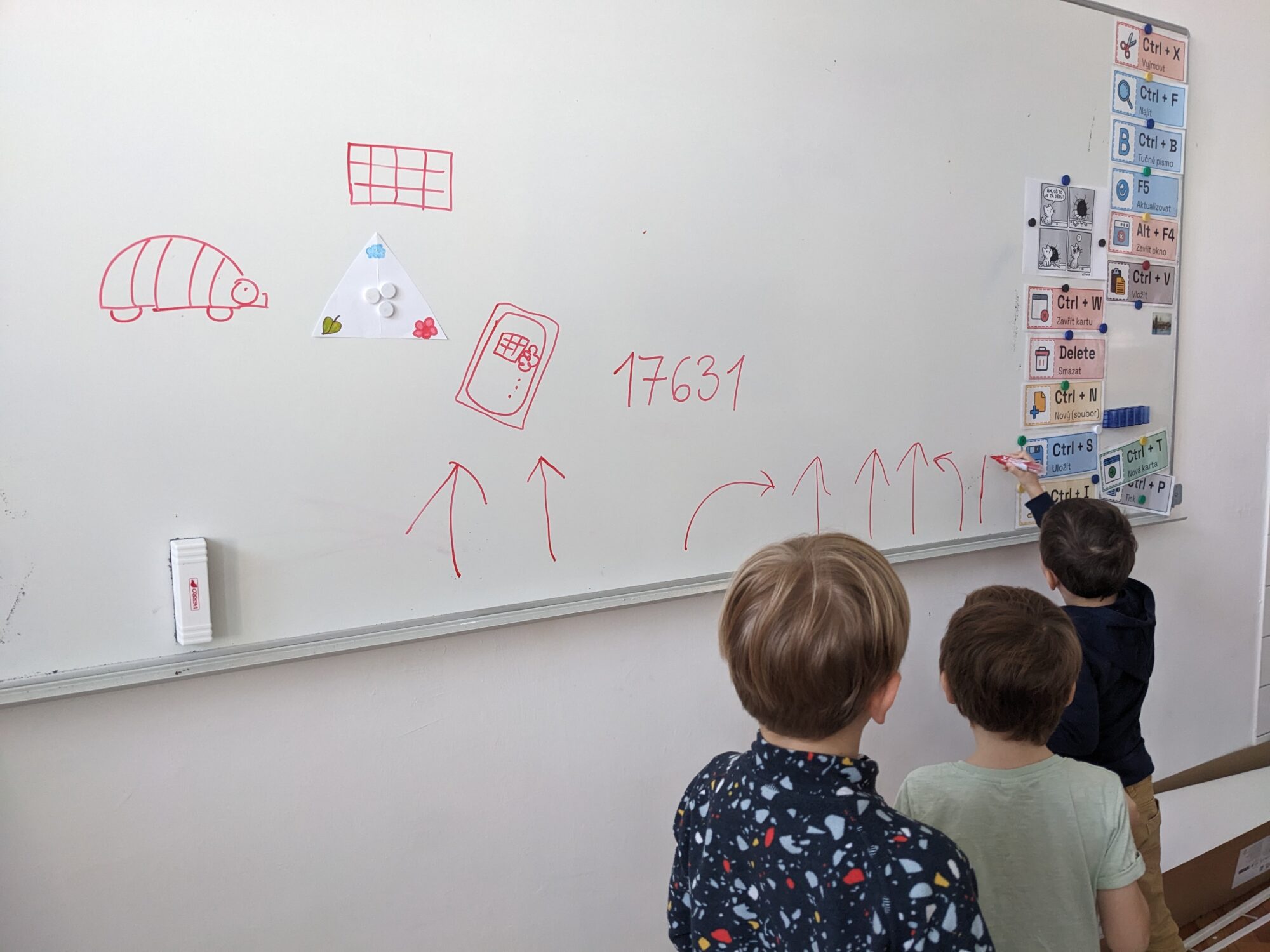 Při informatice s našimi prvňáky si stále hrajeme. Pochopili jsme, jak jsou algoritmy důležité, a to doslovně, když jsme se stali roboty. Programování Bee-Botů není pro prvňáčky úplně jednoduchá záležitost, i když dospělákům to jednoduché připadá. Často jsme naráželi na to, že se někteří neorientují v prostoru, nepamatují si pravou a levou stranu, i když máme mnemotechnické pomůcky (např. „Píšu Perem Pravou“ rukou – vše začíná na P, pravá ruka je tedy ta, kterou píšou).