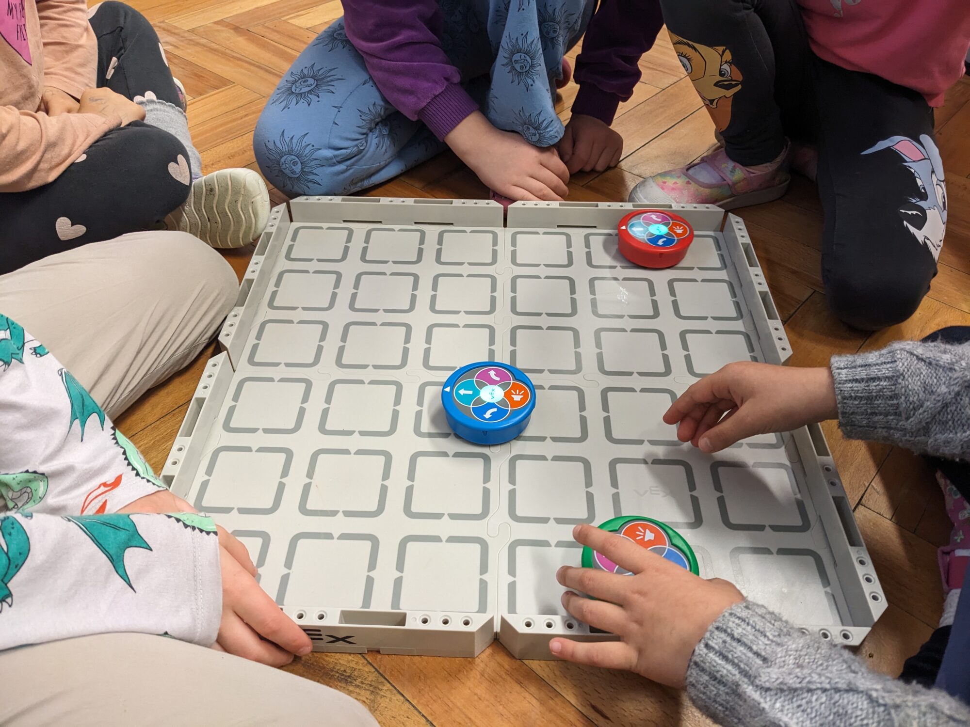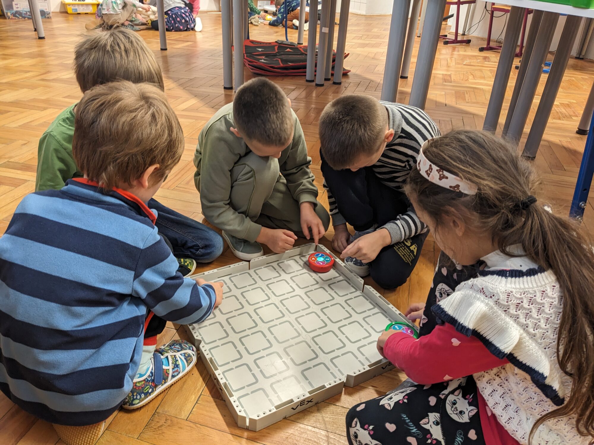 Nedávno se děti seznámily s VEXem 123. Sami měli badatelsky vyzkoumat, jak se ovládá a porovnat to s BeeBotem. V podstatě tam není žádný rozdíl až na zapínání, vypínání a mazání programu na té nejjednodušší úrovni, kdy pracujeme bez kodéru a neprogramujeme v blocích online. Zkoušeli jsme překážky na herním poli – objíždět samolepky není úplně ono (prvňáci se měli vyhnout drakům), proto příště zvolíme trojrozměrné objekty jako domečky, autíčka z Lega apod., aby se roboti mohli projet i ve 3D městě.