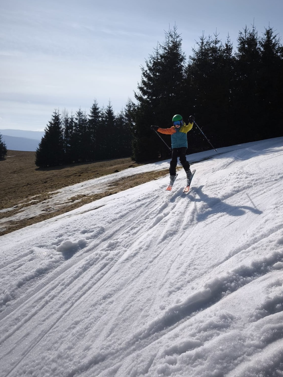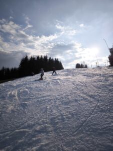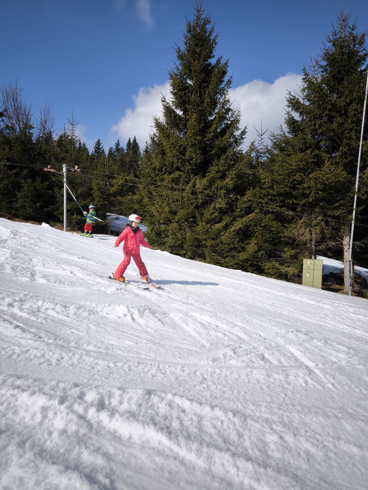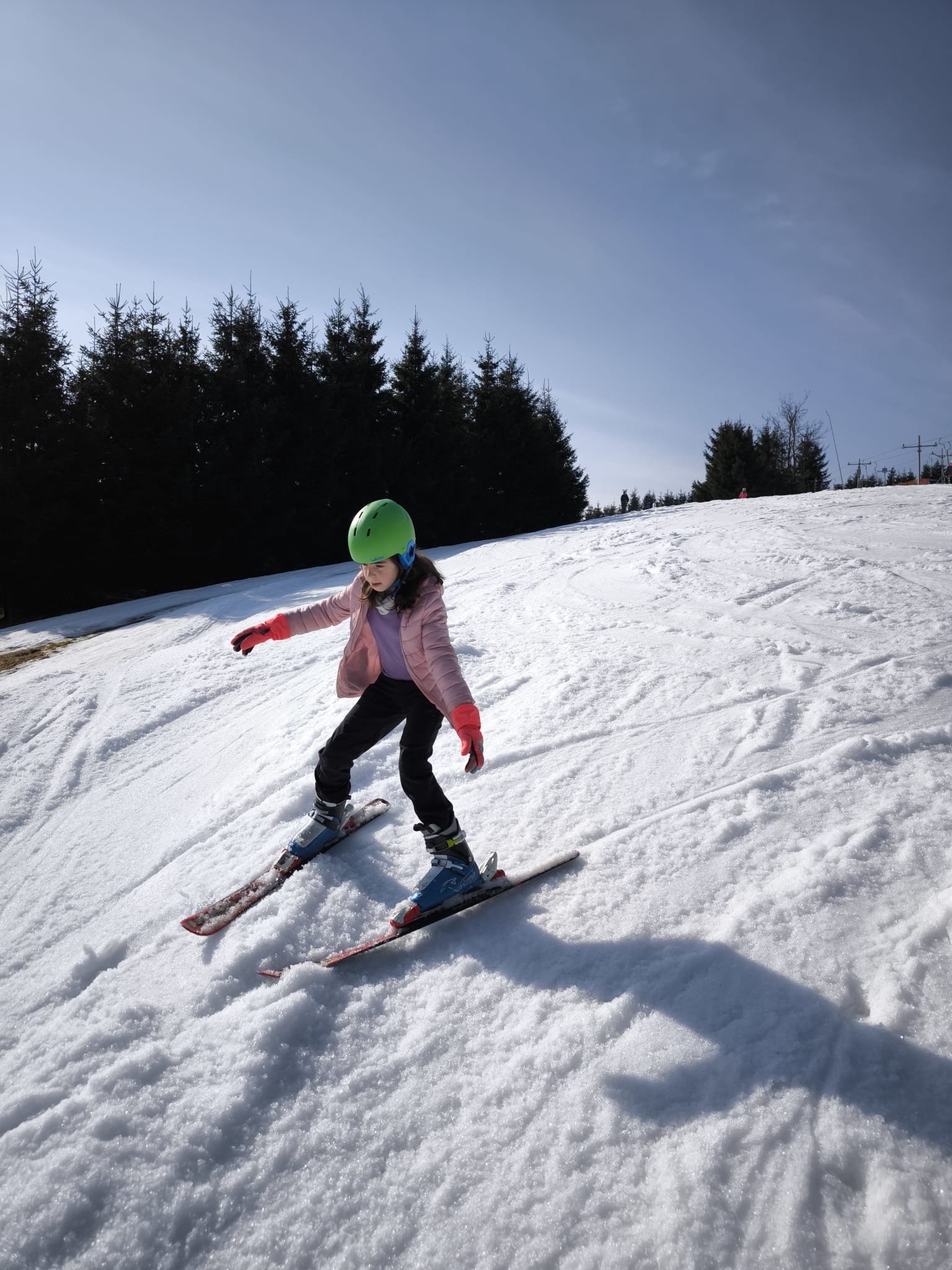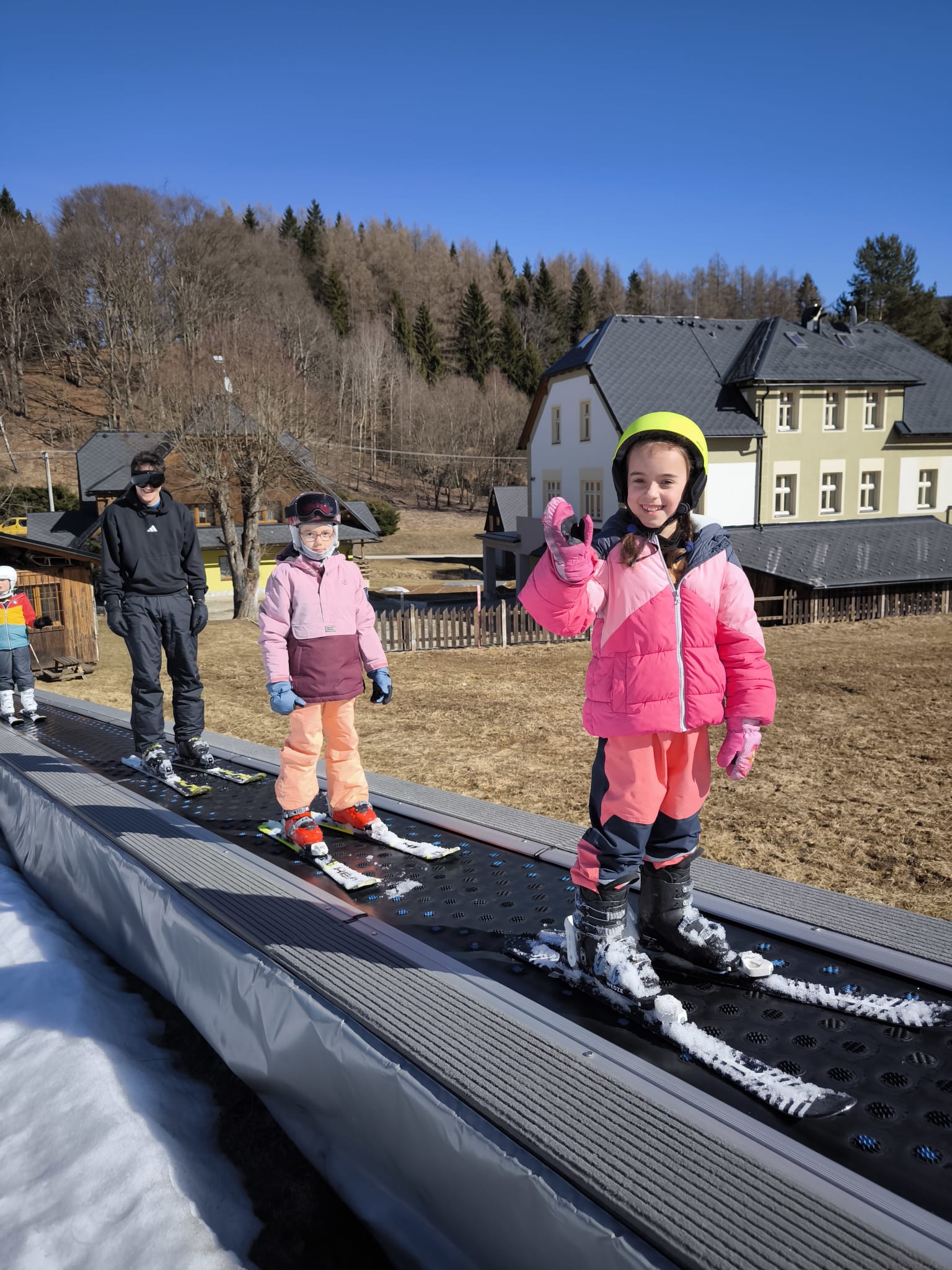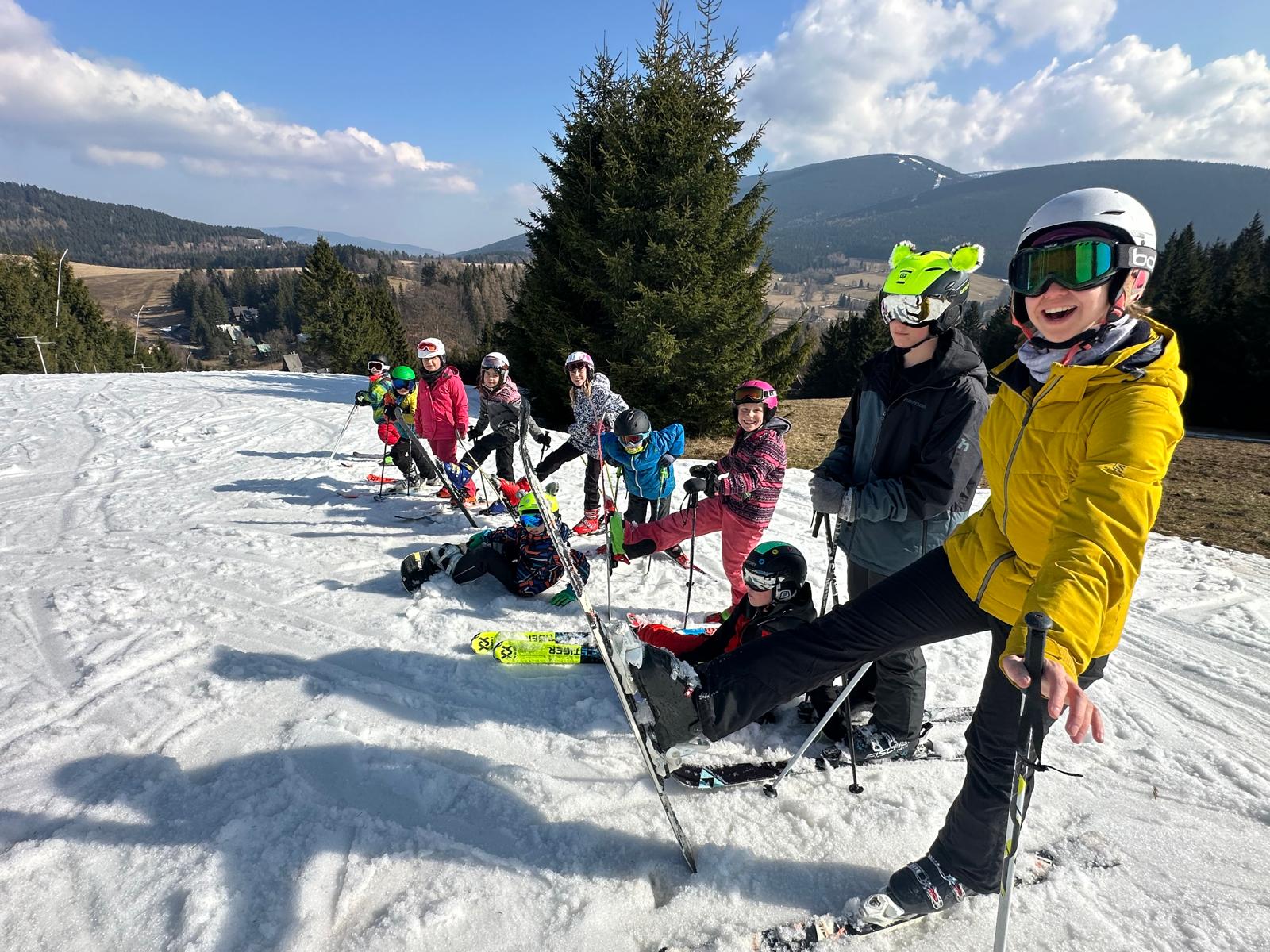 Druhý den už patřil prvnímu kontaktu se sjezdovkou. 🏂 Některé děti stály na lyžích úplně poprvé, a tak se učily od úplných základů, zatímco zkušenější lyžaři si mohli vyzkoušet jízdu na velké sjezdovce. 🤩 I když sněhu v okolí nebylo mnoho a počasí už připomínalo jaro, sjezdovka byla v dobrém stavu a lyžování nám nic nezkazilo. 😎