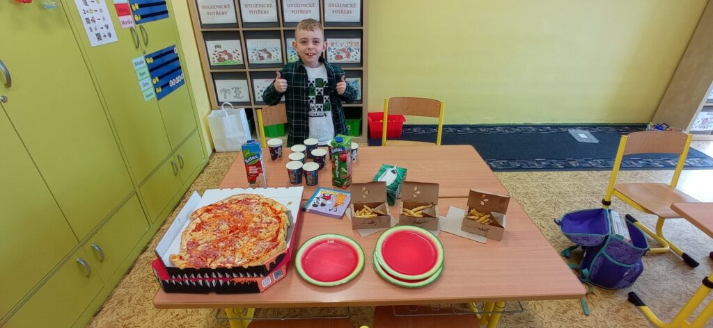 Ve středu oslavil sedmé narozeniny náš spolužák Dymo. 🥳 Pro svou třídu si přichystal velkolepou hostinu, velkou přestávku jsme tedy strávili s pizzou, džusem a byla i sladká tečka na závěr. 🍕😋 Pro děti to bylo velké a milé překvapení, děkujeme Dymovým rodičům a Dymovi přejeme ještě jednou všechno nejlepší! 🤩