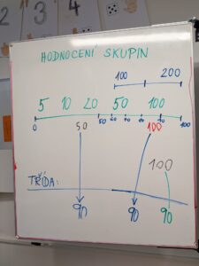 💰 Třetí hodinu jsme věnovali kromě zpětné vazby i odměňování. Při té příležitosti, kdy děti získávaly zlaťáky za postup týmu a odvedenou práci, se seznámily s číselnou osou. Výplatu týmům určovaly děti samy a snažily se k tomu přistupovat spravedlivě, takže došlo i na aritmetický průměr. Mluvili jsme o tom, jak by se děti odměnily za odvedení špatné práce, poloviny práce, celé práce s hodinovým zpožděním a jak by hodnotily toho, kdo vzal práci celého týmu na svá bedra, chtěl to sám dotáhnout a pak se zhroutil. 🤔 Demokraticky jsme hlasovali, vzájemně se hodnotili – o výši výplaty pro tým rozhodovali ostatní, kteří v týmu nebyli. Obhajovali jsme svá řešení a pracovali s čísly většími než v učebnici. Hlavičky nám fungovaly na plné obrátky. 😎