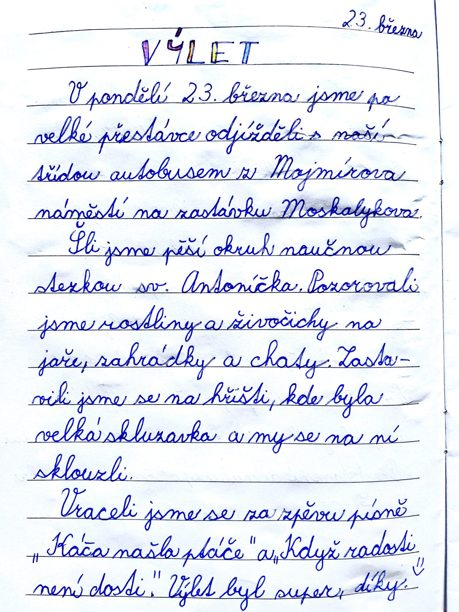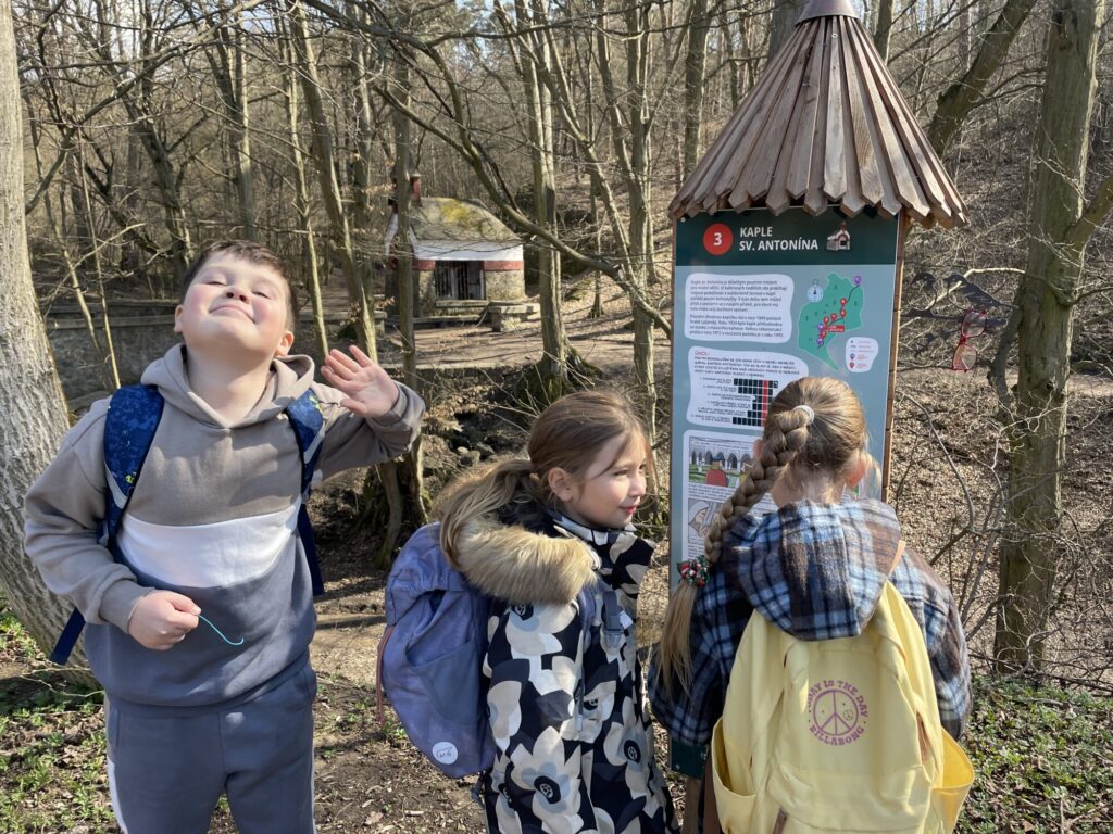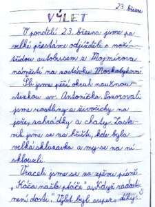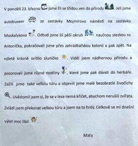 „Dneska jsme šli na výlet na naučnou stezku sv. Antoníčka. Pozorovali jsme krajinu okolí lidských sídel. Určovali jsme jarní rostliny. Vyprávěli jsme si o panovnících českých zemí. Také jsme hádali jména historických osobností.“ Katka
