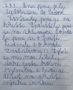 „Dnes jsme byli v lese a hráli jsme hádací hru. Učili jsme se poznávat rostliny a viděla jsem jich opravdu hodně. Objevila jsem víc zajímavých věcí, než jsem čekala. Jsem na sebe hrdá, protože jsem se naučila nové rostliny. Výlet se mi moc líbil a byl zajímavý.“ Jana