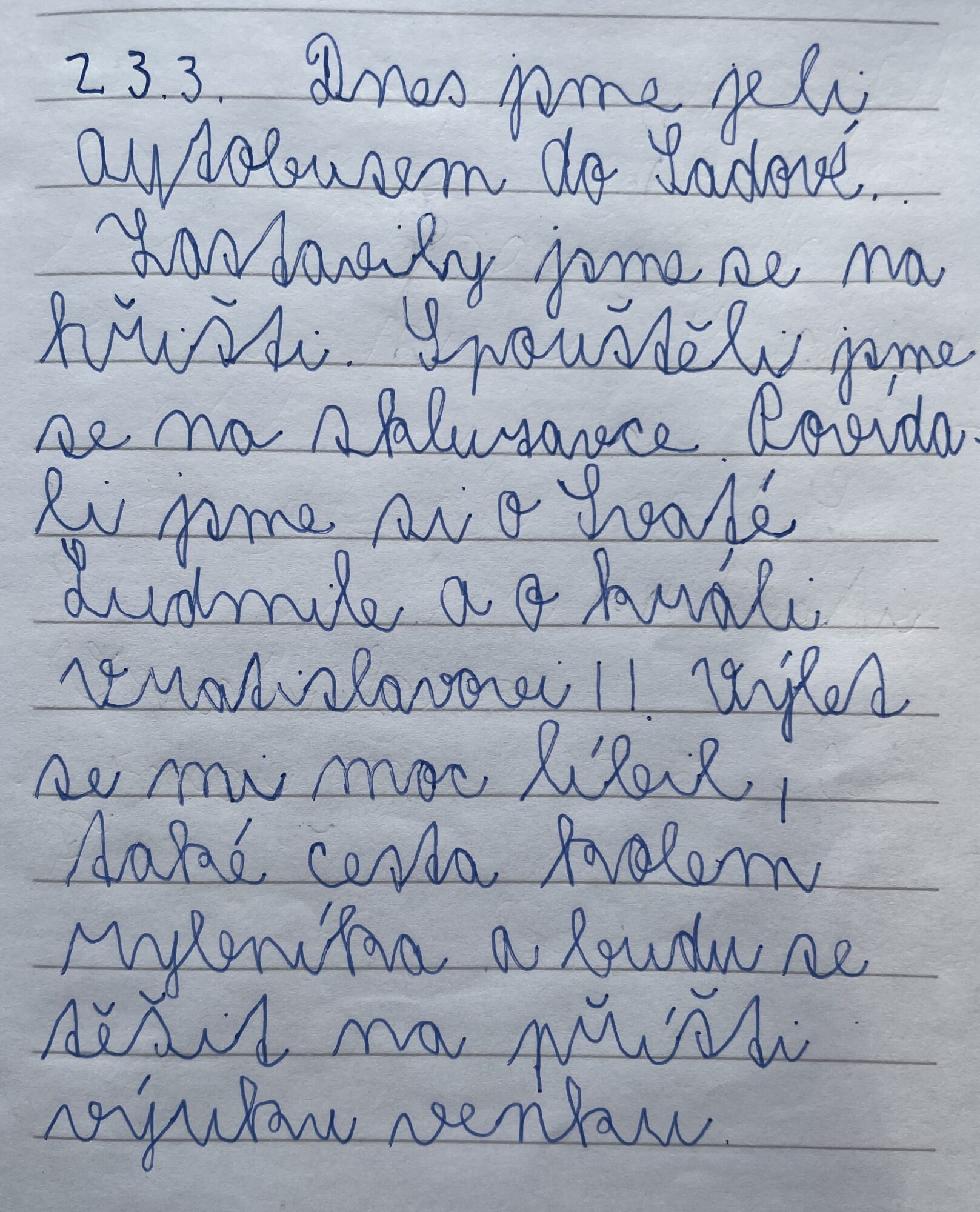 „V pondělí 23. 3. jsme byli se třídou čtyři hodiny venku a viděli jsme berušku, motýla a ruměnici. Všimla jsem si, že se ruměnice páří. Děti křičely, ale stejně nevyplašily kačenu a kačera. Učili jsme se i o vládcích, např. o Janu Lucemburském. Líbilo se mi, že jsme zpívali písničky Káča našla ptáče a Kapr našel hodiny.“ Sára