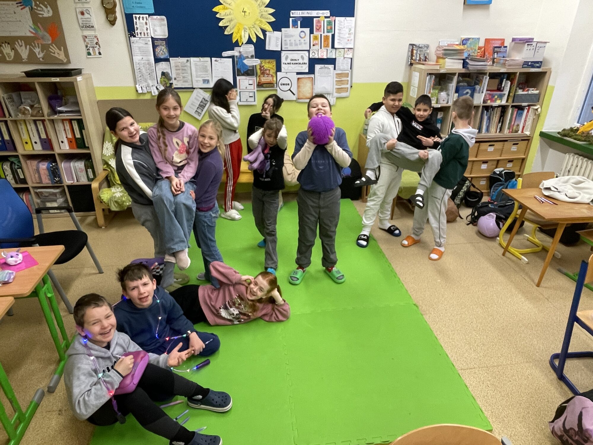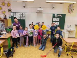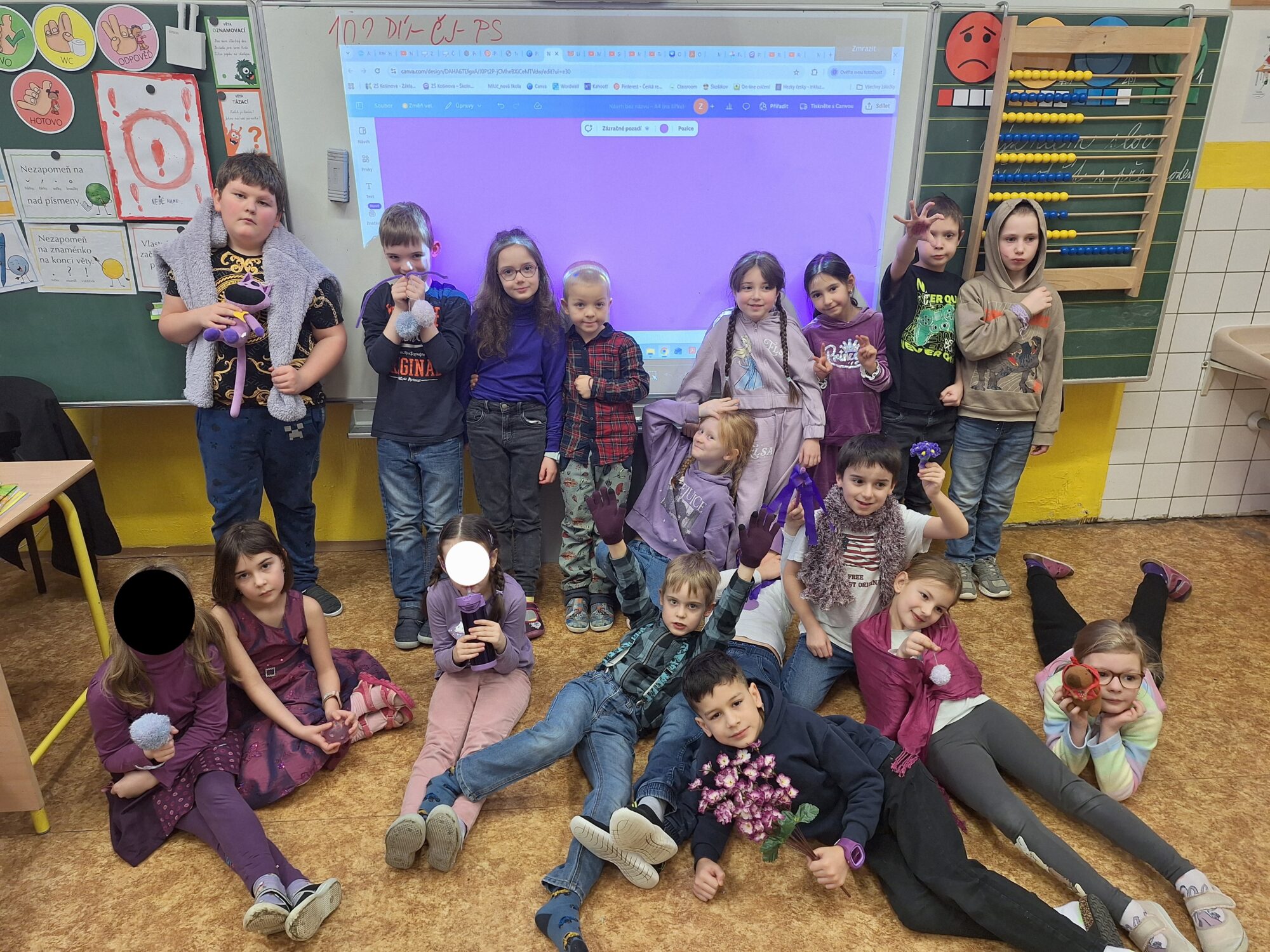 V úterý jsme se oblékli do fialové barvy pohody. Žáci čtvrtého ročníku s nadšením obešli celou školu od paní kuchařek v jídelně, uklízeček, žáků, učitelů i vedení, s úsměvem popřáli pěkný den a nabídli jim bonbóny nebo mrkev pro zpříjemnění dne. 🌞 O velké přestávce mohly třídní kolektivy vytvořit živou „sochu pohody“ a společně se vyfotit. 📷