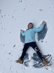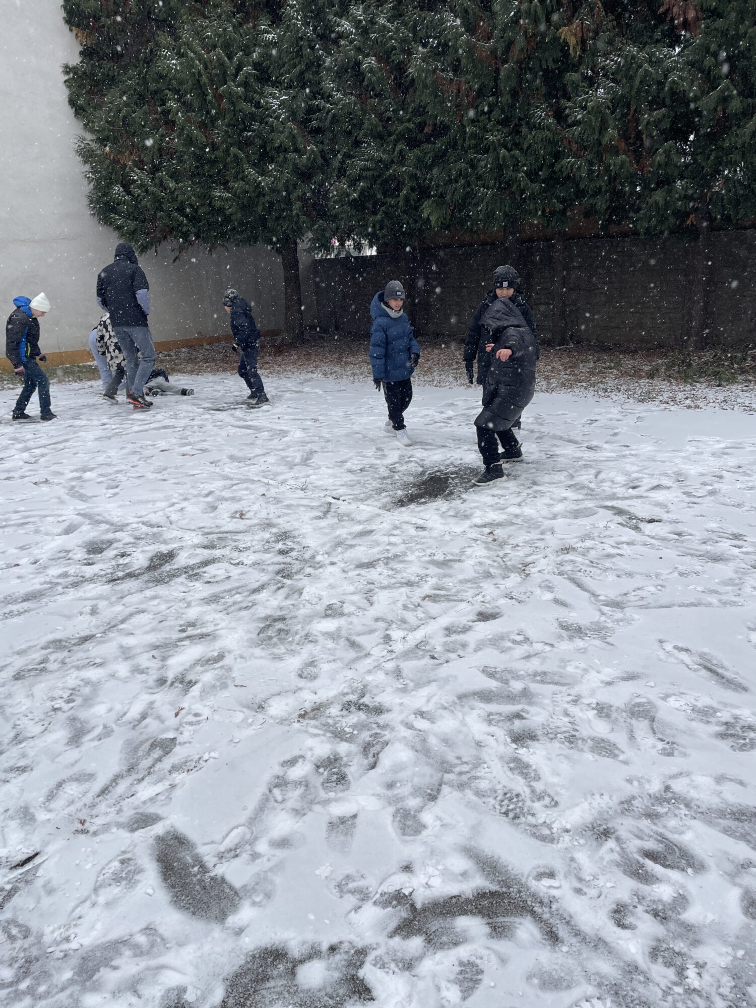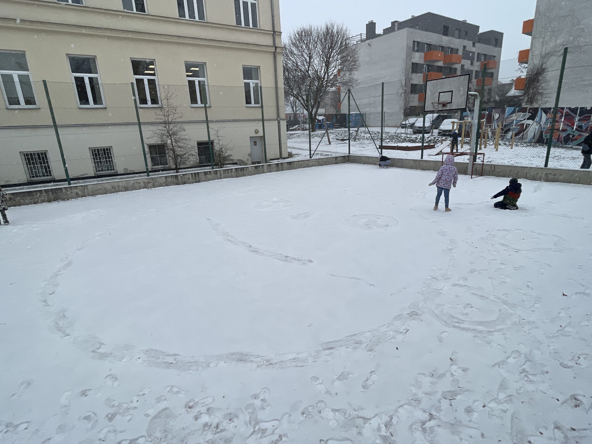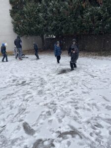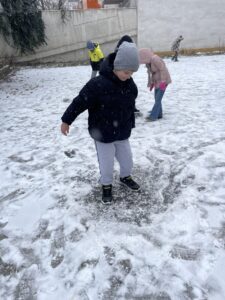 Při tom všem se učíme a reflektujeme. Na jaké povrchy si dát pozor před uklouznutím? Proč nejdříve požádat o souhlas s koulováním spolužáka, než mu jen nečekaně hodit kouli za krk? Jak si zahřát promrzlé ruce šetrně? Jak se nám dařilo spolupracovat jako třídě při tvoření jednoho společného obrazu do sněhu?
